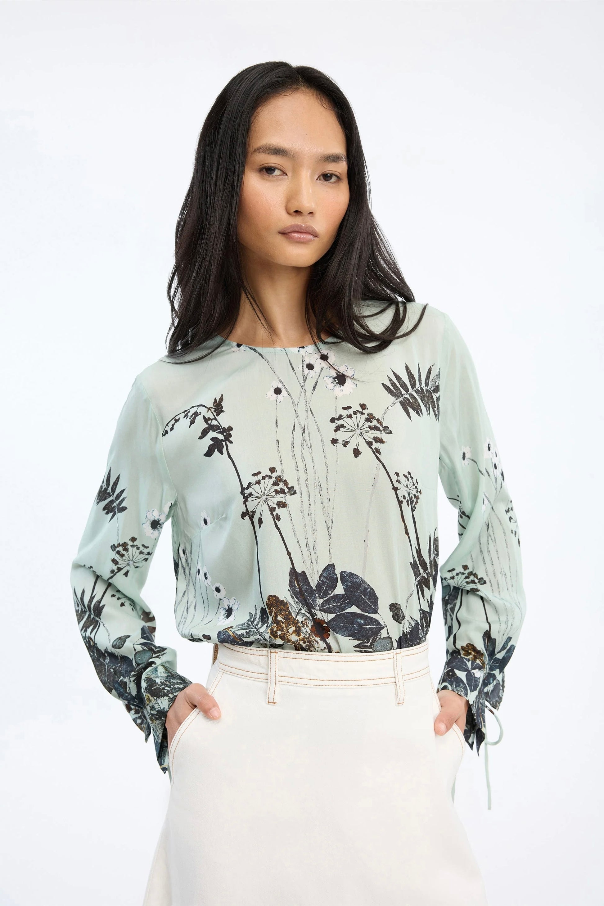 - Lange Ärmel mit kleinen Bindebändern an Handgelenken