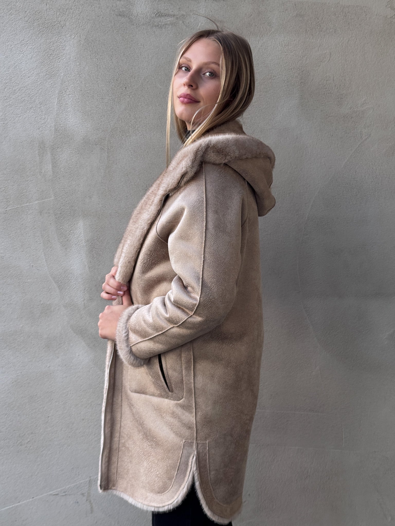 Kunstfellmantel mit Kapuze und flauschiger Haptik.