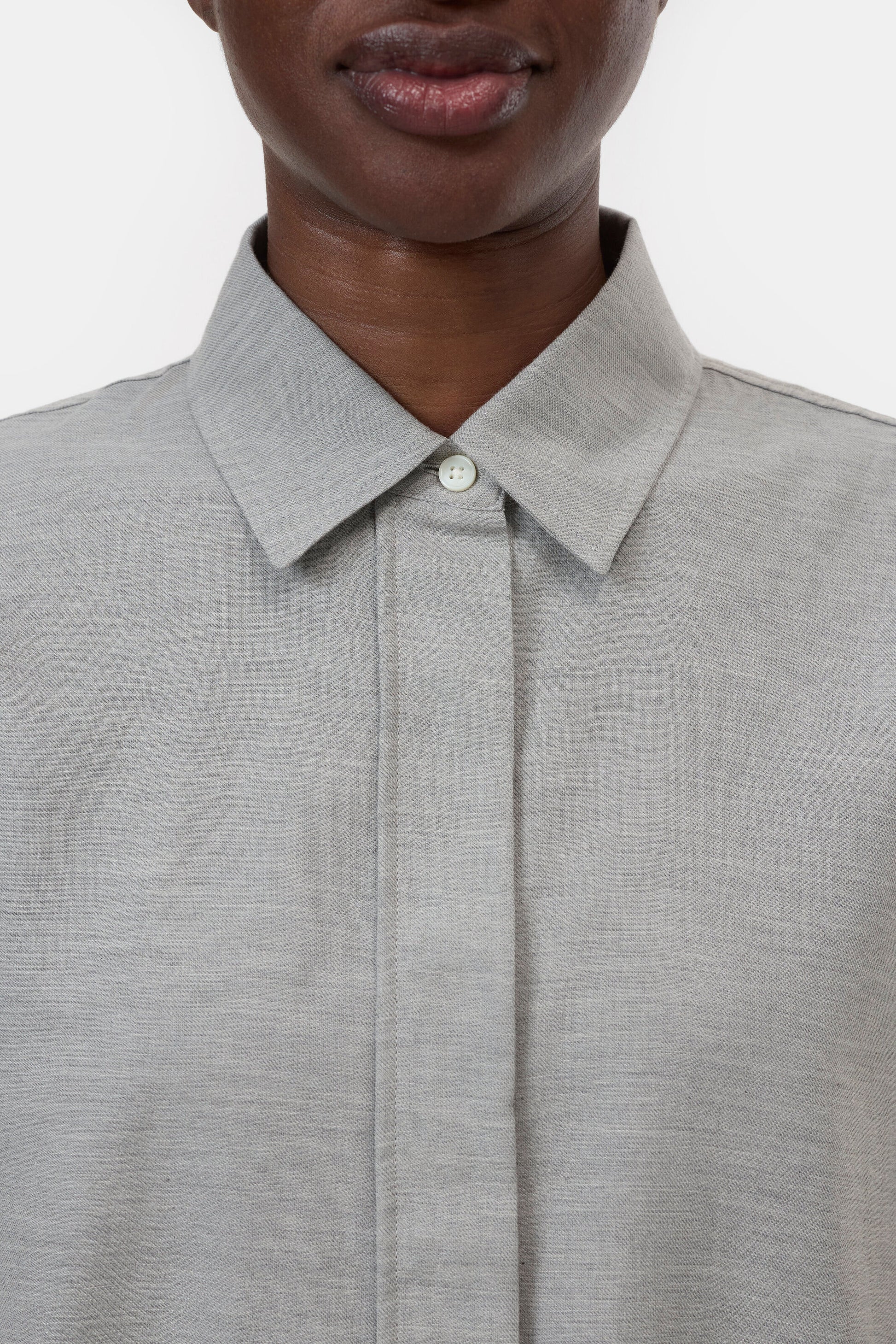 Die Bluse kombiniert klassisches Design mit modernem Twist. Der asymmetrische Schnitt mit verdeckter Knopfleiste und eleganten Manschettenfalten verleiht ihr eine besondere Silhouette. Gefertigt aus einer weichen Baumwoll-Kaschmir-Mischung bietet sie hohen Tragekomfort und ein angenehmes, warmes Gefühl. Ein vielseitiges Piece – perfekt für Büro, Freizeit oder Dinner.