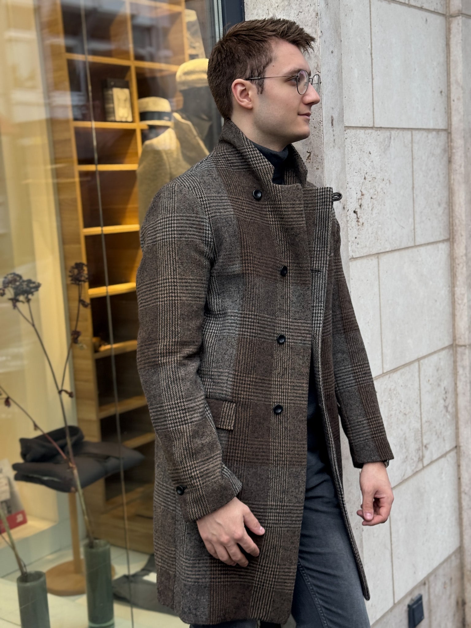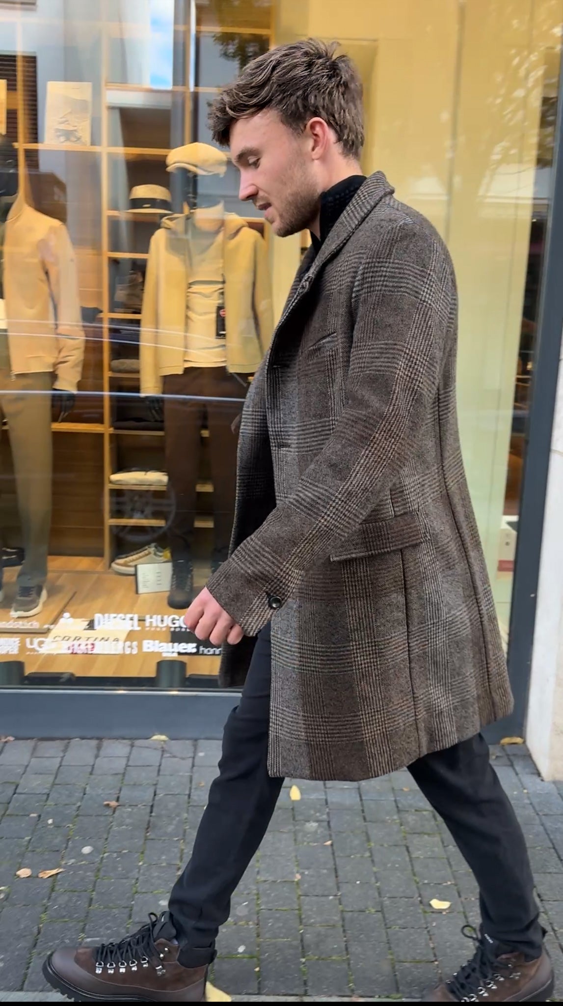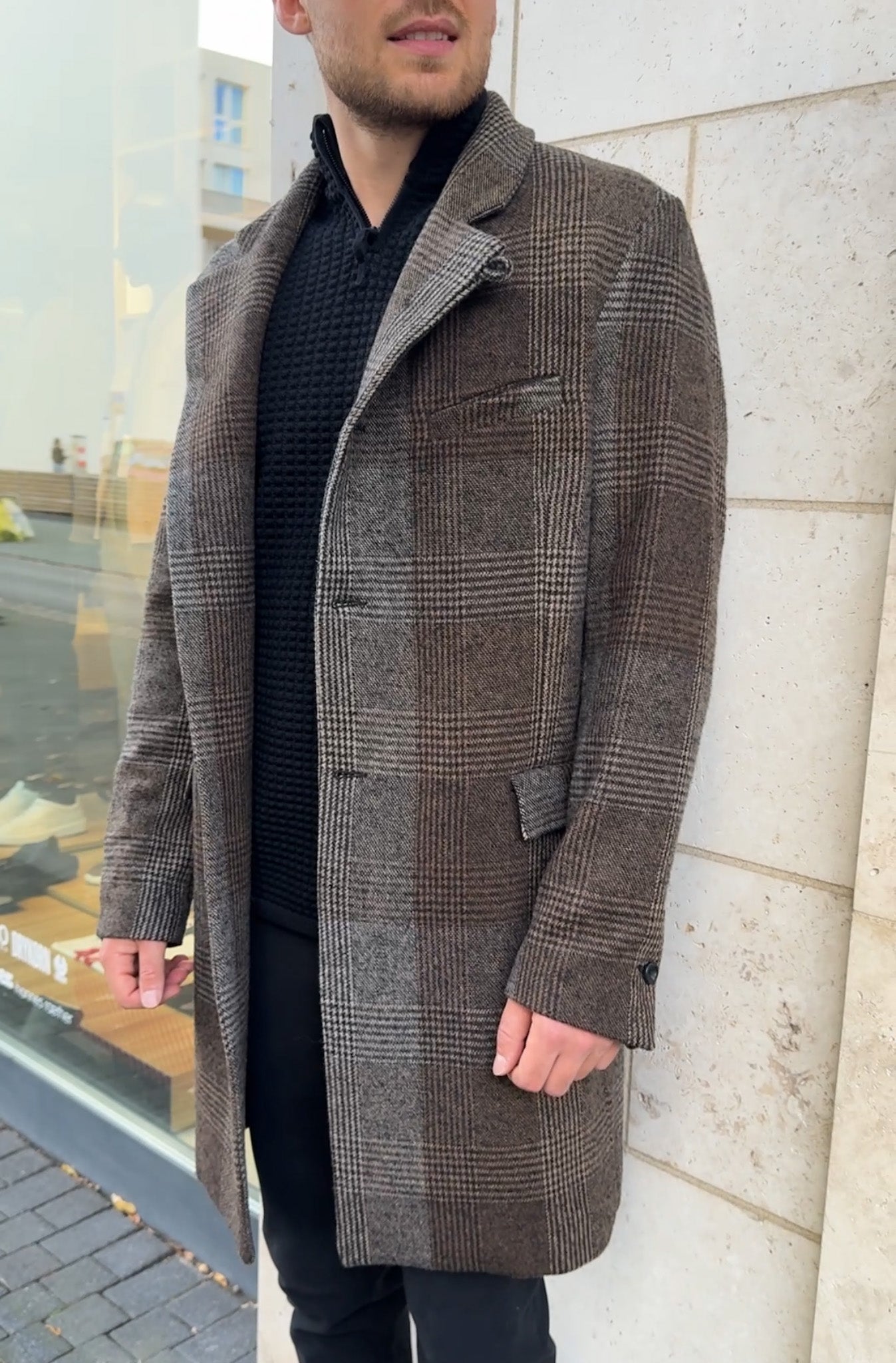 Ein klassischer Herrenmantel mit feinem Karomuster, der durch seinen klaren Schnitt und hochwertige Wollmischung überzeugt. Der kleine Reverskragen und die schmalen Ärmel verleihen ihm eine elegante Silhouette – ideal für stilvolle Auftritte in der kühlen Jahreszeit.