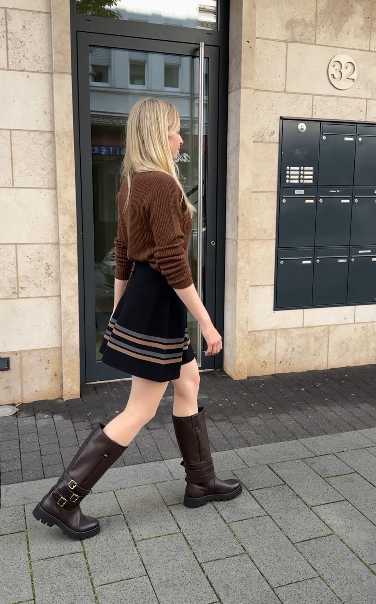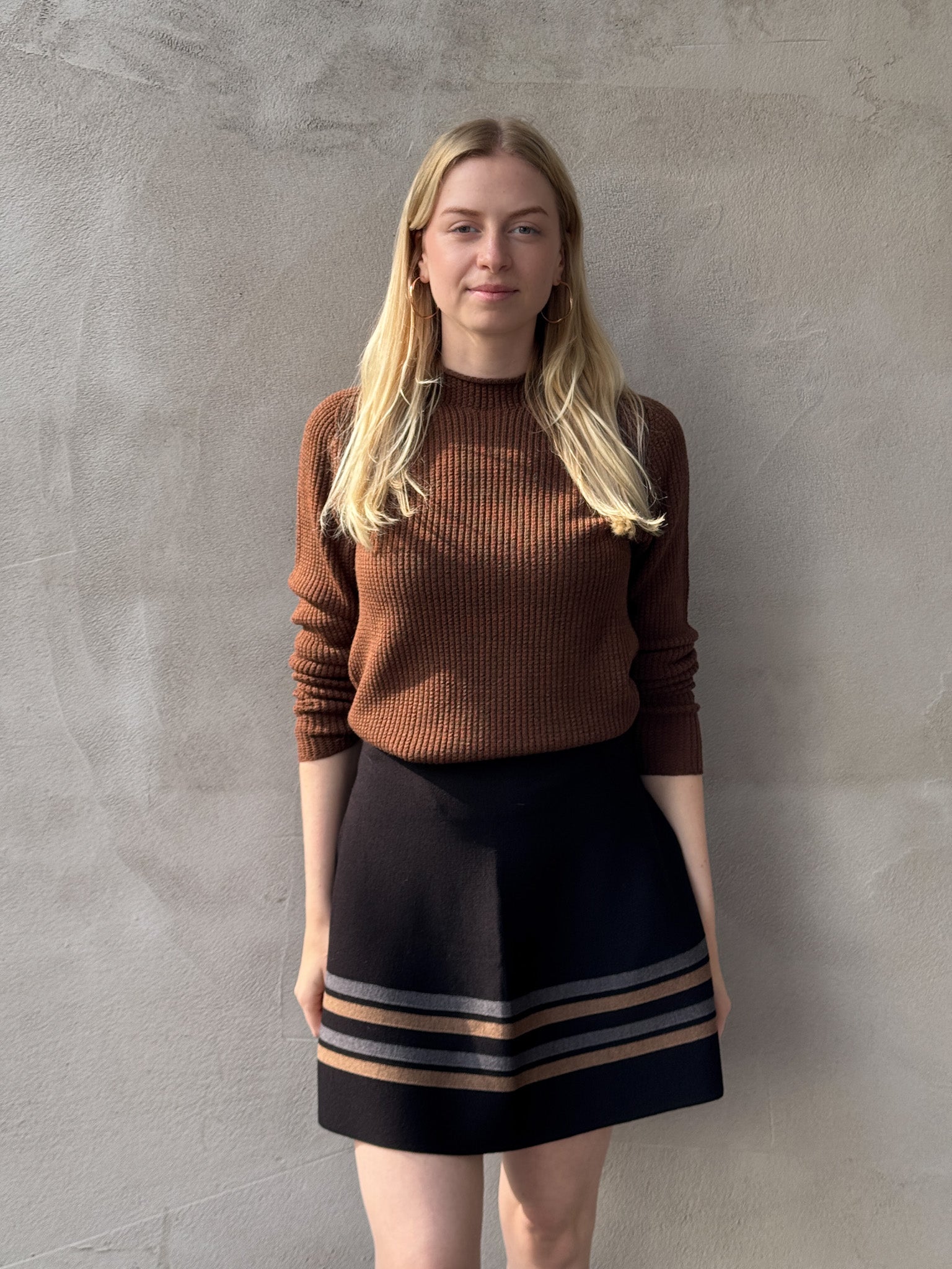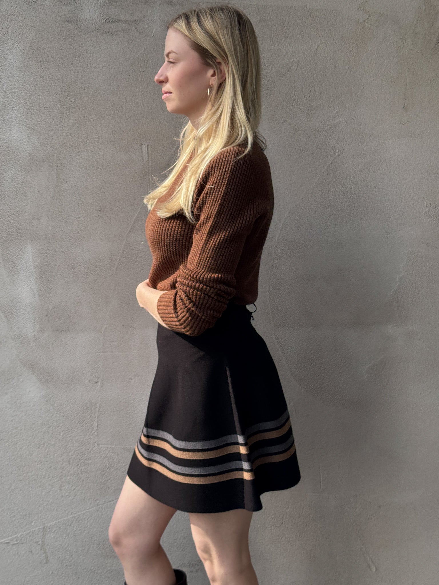 Aus 100 % Merinowolle gefertigt, überzeugt dieser Mini Strickrock mit glatter, dichter Strickqualität und einem ausgestellten Schnitt in Tulpenform – feminin und zeitlos.