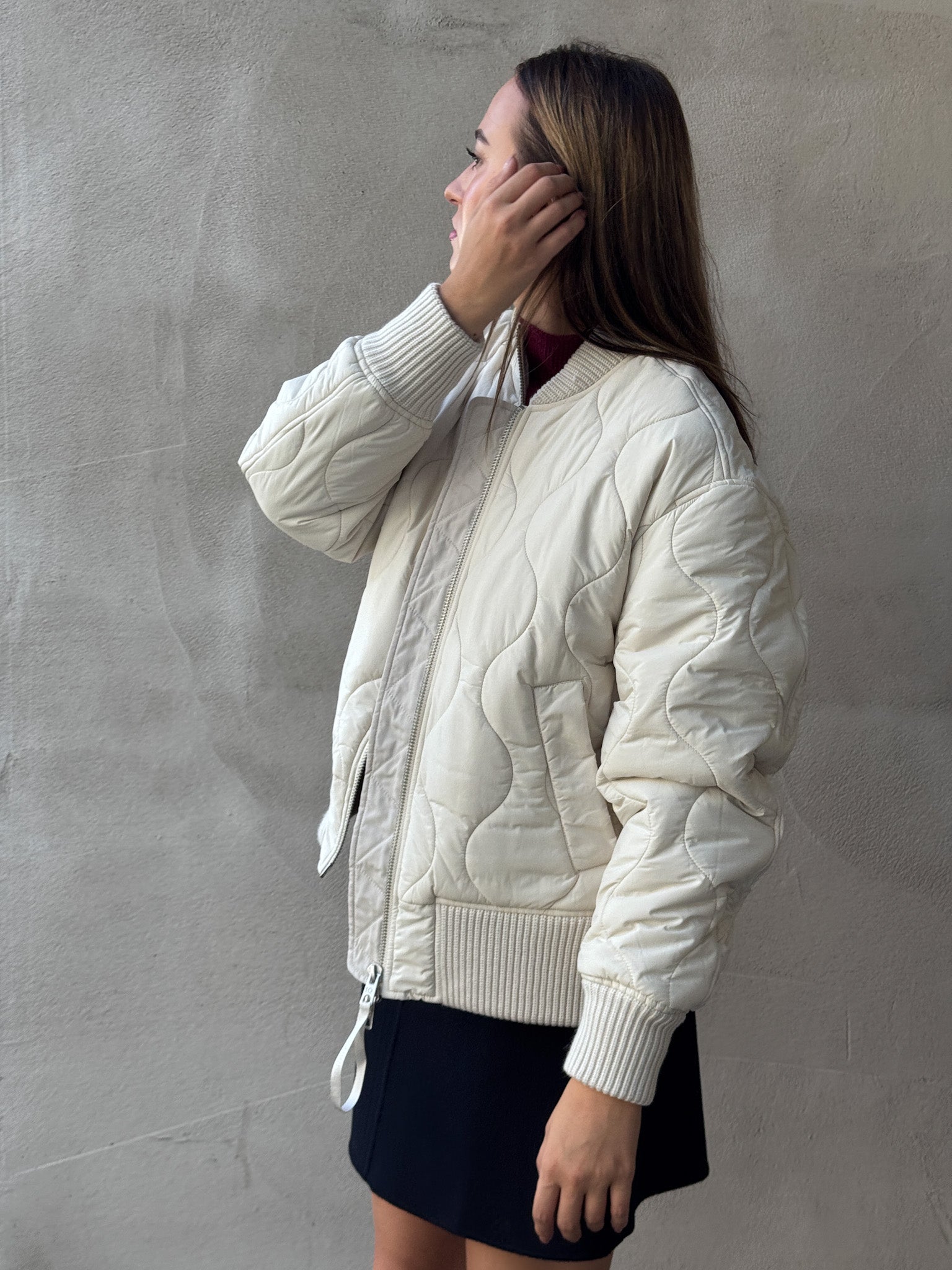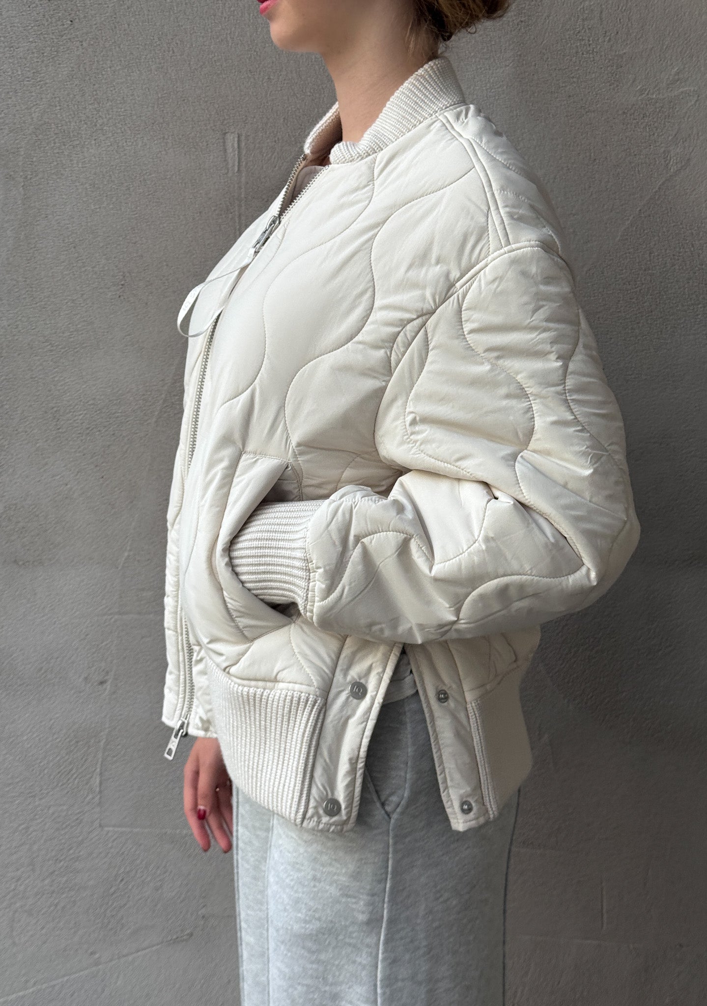 Die wollweiße Steppjacke von IQ Studio präsentiert sich in sportlich-lässigem Design mit markantem Bomberjacken-Schnitt. Die seitlichen Druckknöpfe sorgen für variable Weite, während die oversized Passform und die kurze Länge einen modernen Look erzeugen. Perfekt für trendbewusste Outfits an kühleren Tagen.