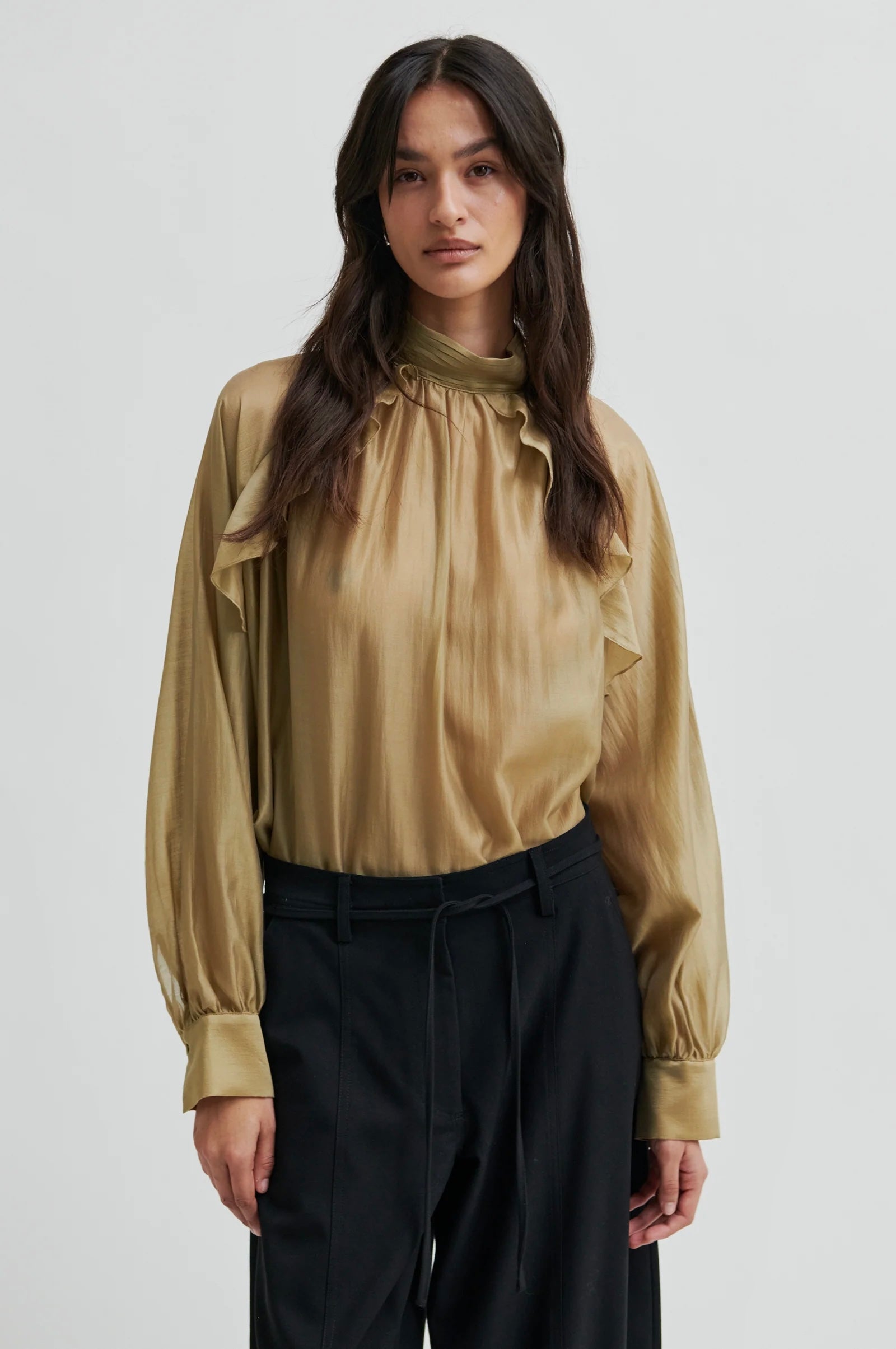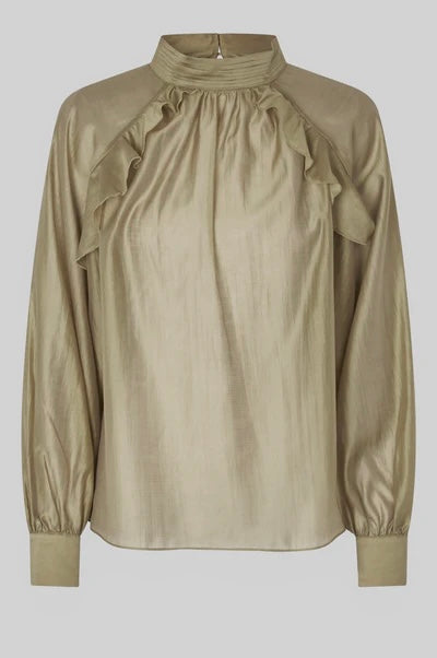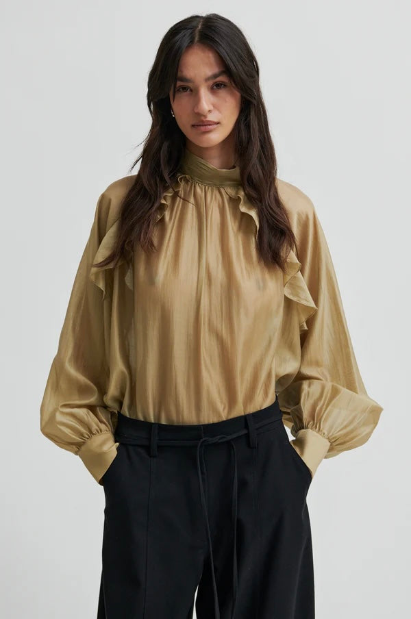 Leichte Bluse aus semi-transparenter Qualität mit raffinierten Volants – eine feminine Wahl mit fließender Silhouette.