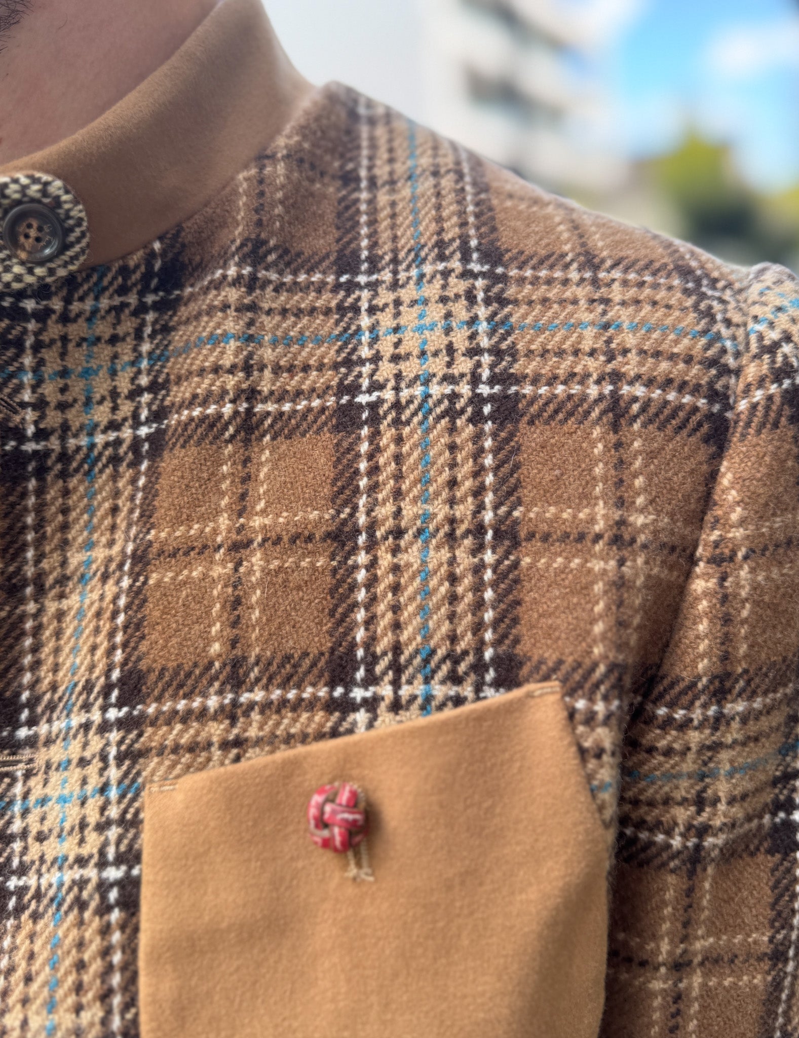 - Vorderseite: 70 % Wolle, 25 % Nylon, 5 % andere Fasern – Karomuster