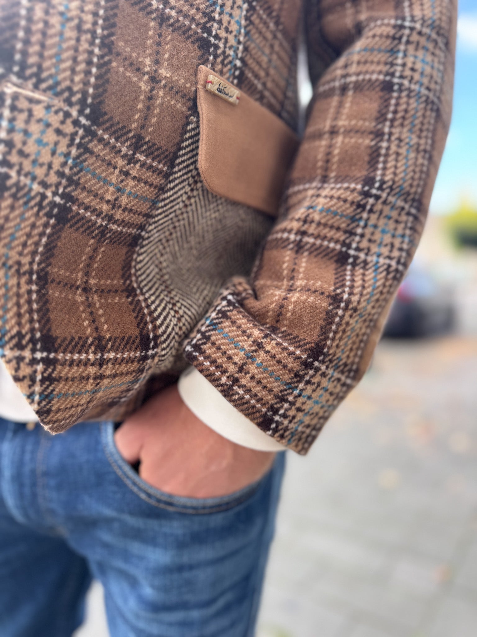 - Eine Brusttasche mit geflochtenem Lederknopf