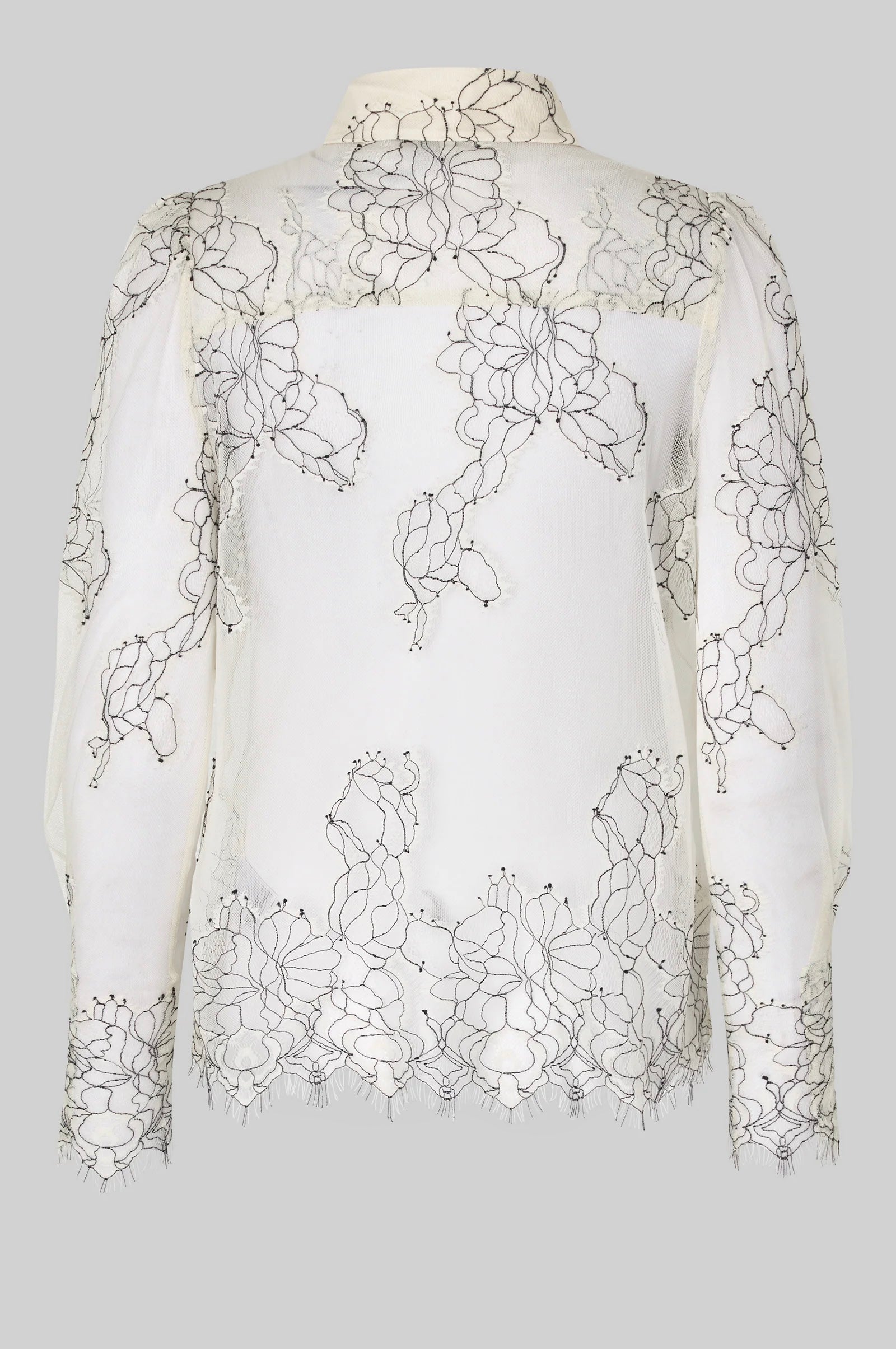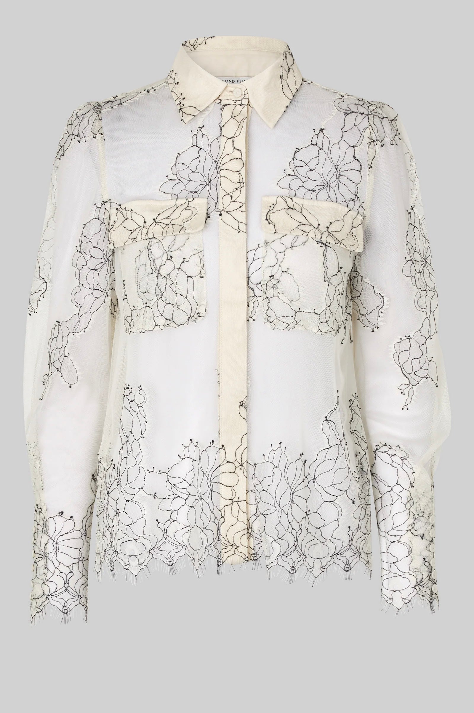 Leichtes, transparentes Hemd aus zarter Spitze mit kontrastierenden Nähten. Mit klassischem Kragen, verdeckter Knopfleiste und zwei Brusttaschen. Der wellenförmige Saum und die Ärmelabschlüsse verleihen dem Hemd eine feminine Note. Reguläre Passform für einen modernen, vielseitigen Look.